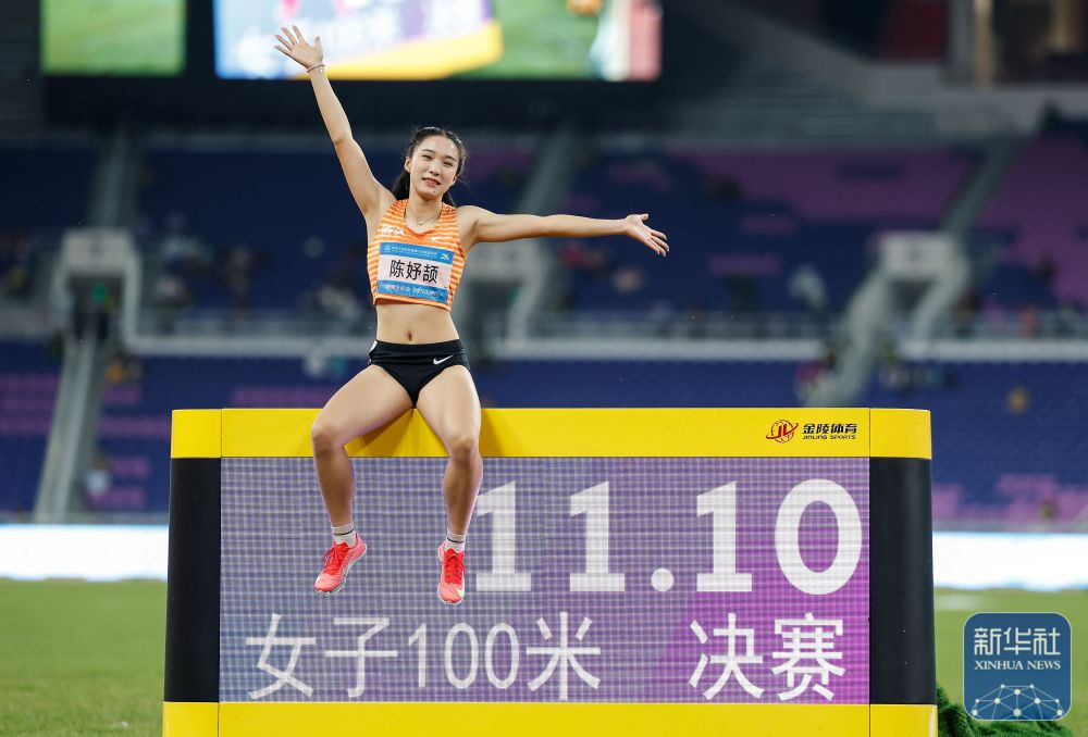 2025年11月17日,浙江队选手陈妤颉在比赛后与成绩显示屏合影。她夺得冠军。当日,第十五届全国运动会田径女子100米决赛在广州举行。新华社记者 黄伟 摄