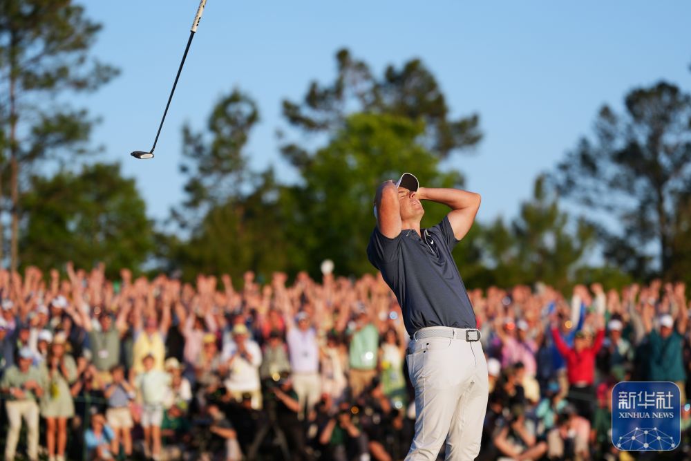 2025年4月13日,北爱尔兰选手麦克罗伊夺冠后庆祝。当日,在美国佐治亚州奥古斯塔举行的第89届美国高尔夫球大师赛结束全部四轮比赛,北爱尔兰选手罗里·麦克罗伊通过加洞赛战胜英格兰选手贾斯汀·罗斯,夺得冠军。新华社记者 吴晓凌 摄