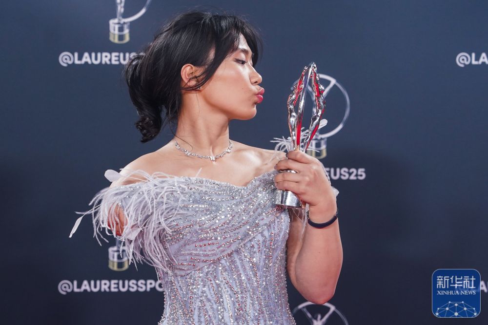 2025年4月21日,蒋裕燕与奖杯合影。当日,2025劳伦斯世界体育奖颁奖典礼在西班牙马德里举行,中国残疾人游泳运动员蒋裕燕获得年度最佳残疾人运动员奖。新华社记者 彭子洋 摄