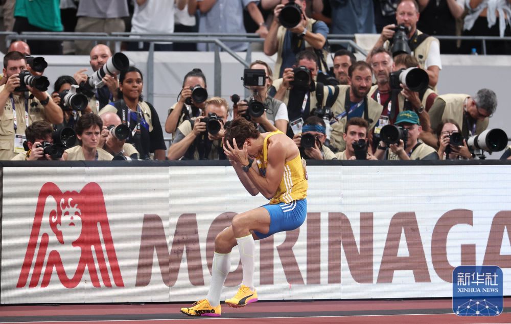 2025年9月15日,杜普兰蒂斯在打破世界纪录后庆祝。当日,在日本东京举行的2025年世界田径锦标赛男子撑杆跳高决赛中,瑞典选手杜普兰蒂斯以6米30的成绩夺冠,并刷新自己保持的世界纪录。新华社记者 贾浩成 摄