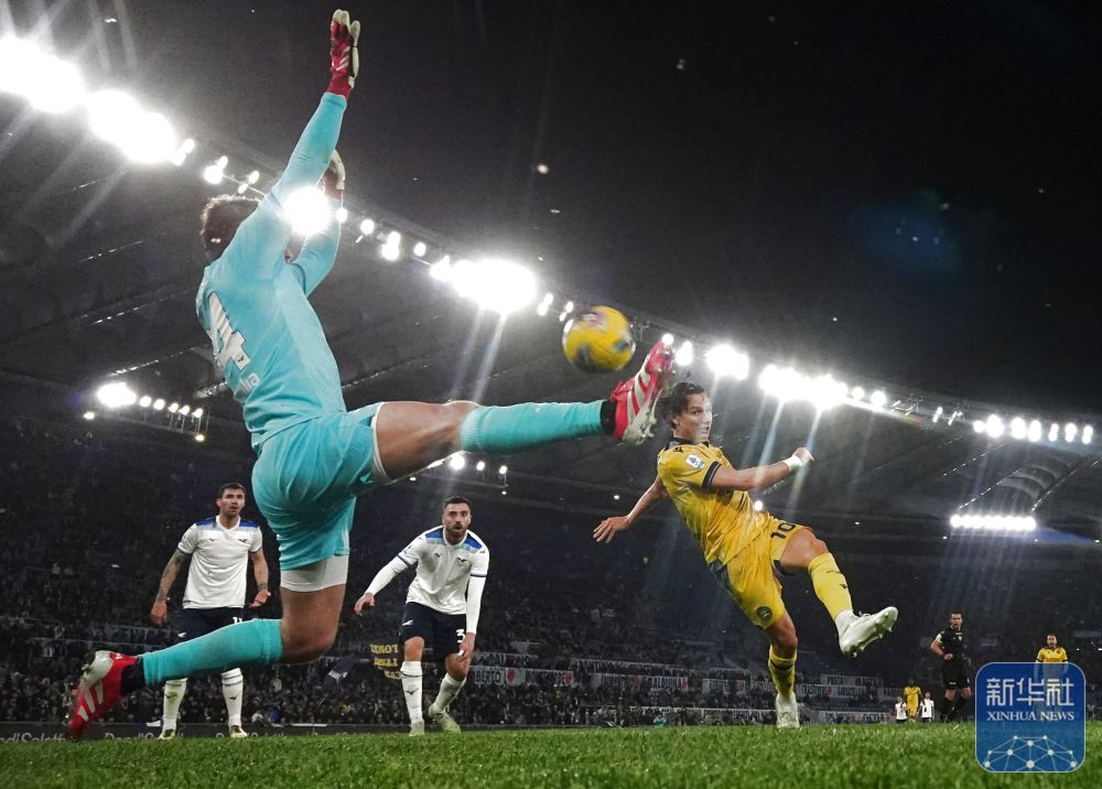 2025年3月10日,乌迪内斯队球员托万(前右)在比赛中射门得分。当日,在2024-2025赛季意大利足球甲级联赛第28轮比赛中,拉齐奥队主场1比1战平乌迪内斯队。新华社发(阿尔贝托·林格利亚摄)