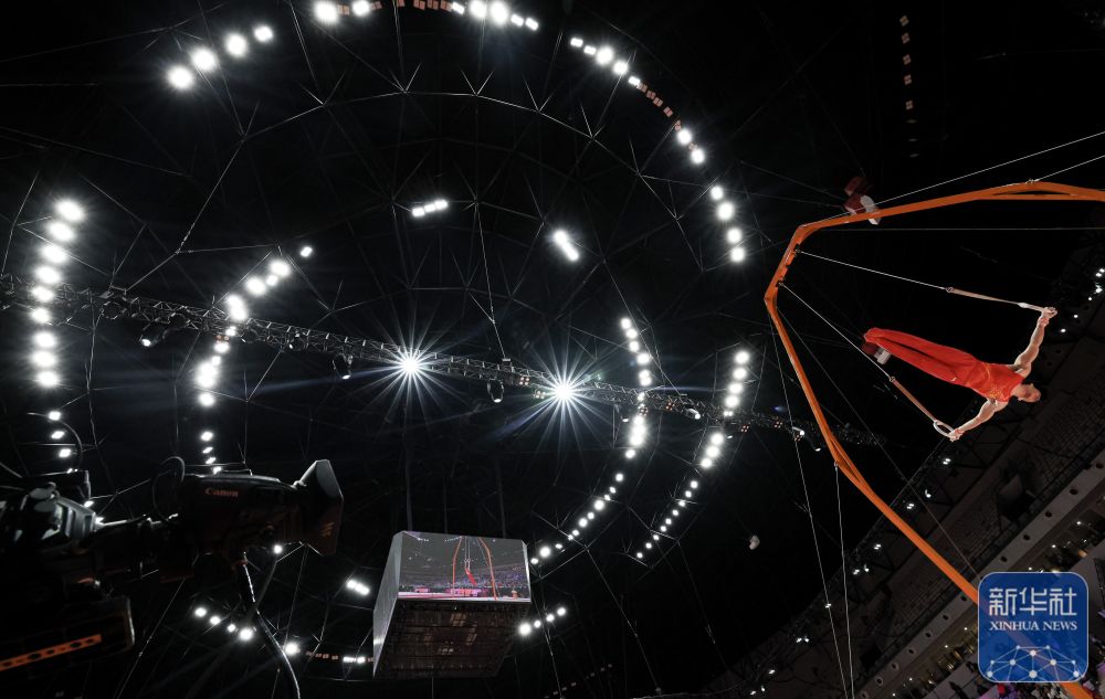2025年10月22日,张博恒在男子个人全能决赛吊环项目比赛中。当日,在印度尼西亚雅加达进行的2025年国际体操联合会(FIG)竞技体操世锦赛男子个人全能决赛中,中国选手张博恒获得亚军。新华社记者 白雪飞 摄