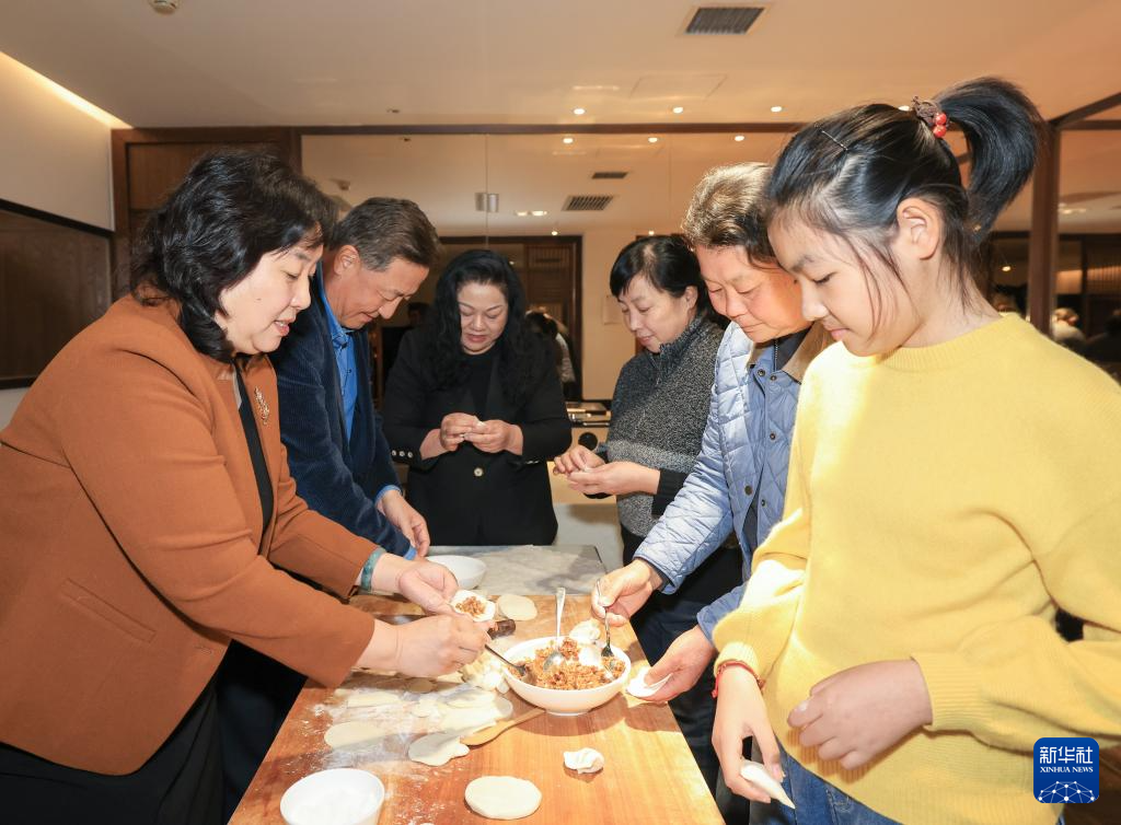 1月4日,在中华英烈褒扬事业促进会,会长李中水(左二)、爱心人士贾秀芳(左一)和“海空卫士”王伟烈士妻子阮国琴(左三)、“人民英雄”张超烈士女儿张上明珠(右一)、卫国戍边英雄肖思远烈士母亲刘利霞(右二)一起包饺子迎接新春。