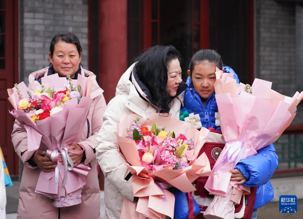 1月4日,中华英烈褒扬事业促进会会长李中水(左二)和爱心人士贾秀芳(左一)给“海空卫士”王伟烈士妻子阮国琴(右二)、“人民英雄”张超烈士女儿张上明珠(右一)、卫国戍边英雄肖思远烈士母亲刘利霞(左三)三位烈属代表送上鲜花与节日慰问品。