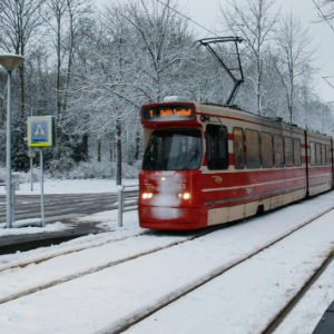 1月7日,在荷兰海牙,一辆电车在积雪轨道上行驶。