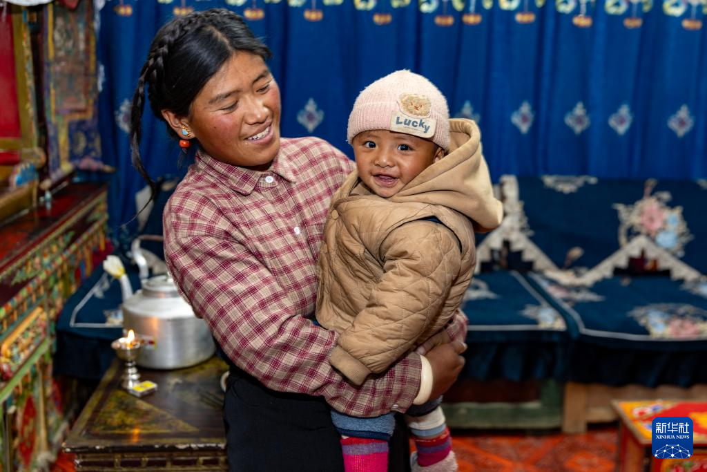 1月5日,在西藏定日县长所乡杂村,母亲朋琼在家中逗弄次仁拉巴。