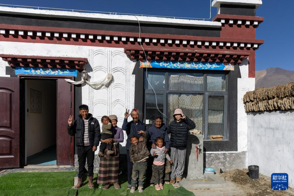 次仁拉姆(左二)和家人在新居前合影(1月5日摄)。