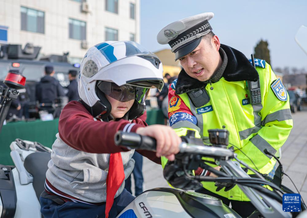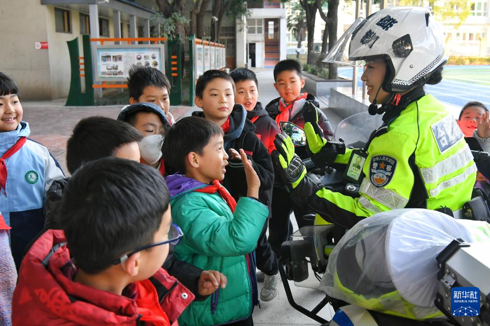 1月9日,安徽省合肥市公安局交通管理支队蜀山大队女子铁骑民警走进合肥市翠庭园小学宣传交通安全知识。