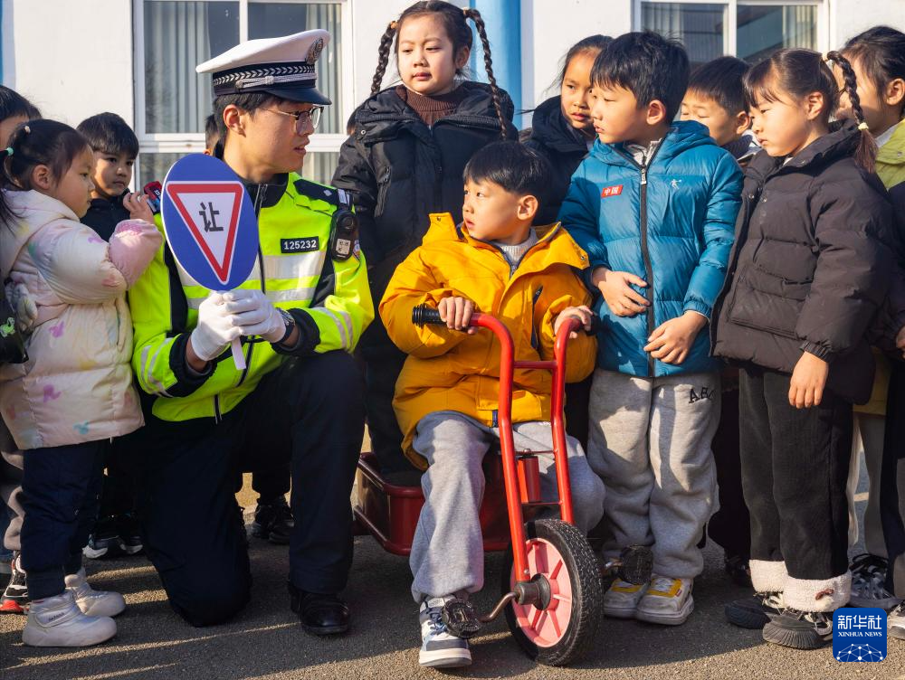 1月9日,交警在江苏省泰州市儿童教育实验中心指导小朋友学习交通安全知识。