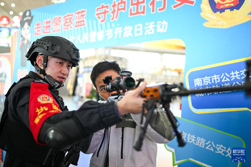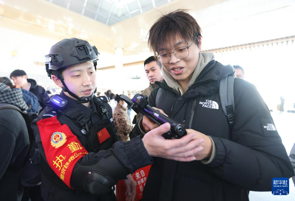 1月9日,在南京南站候车大厅,旅客在南京铁路公安处民警指导下体验警用武器。