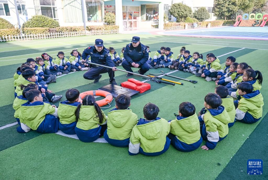 1月9日,在江苏省泰州市御园路幼儿园,泰州市公安局泰州医药高新区分局凤凰派出所民警给小朋友介绍警用装备。