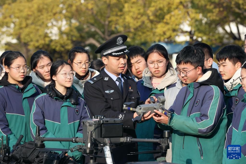 1月7日,江苏省宿迁市公安局宿豫分局珠江路派出所民警向学生介绍警用无人机装备。