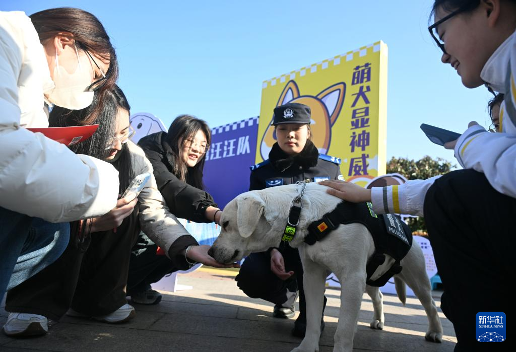 1月8日,在郑州大学启明广场,大学生在警营开放日活动上与警犬互动。