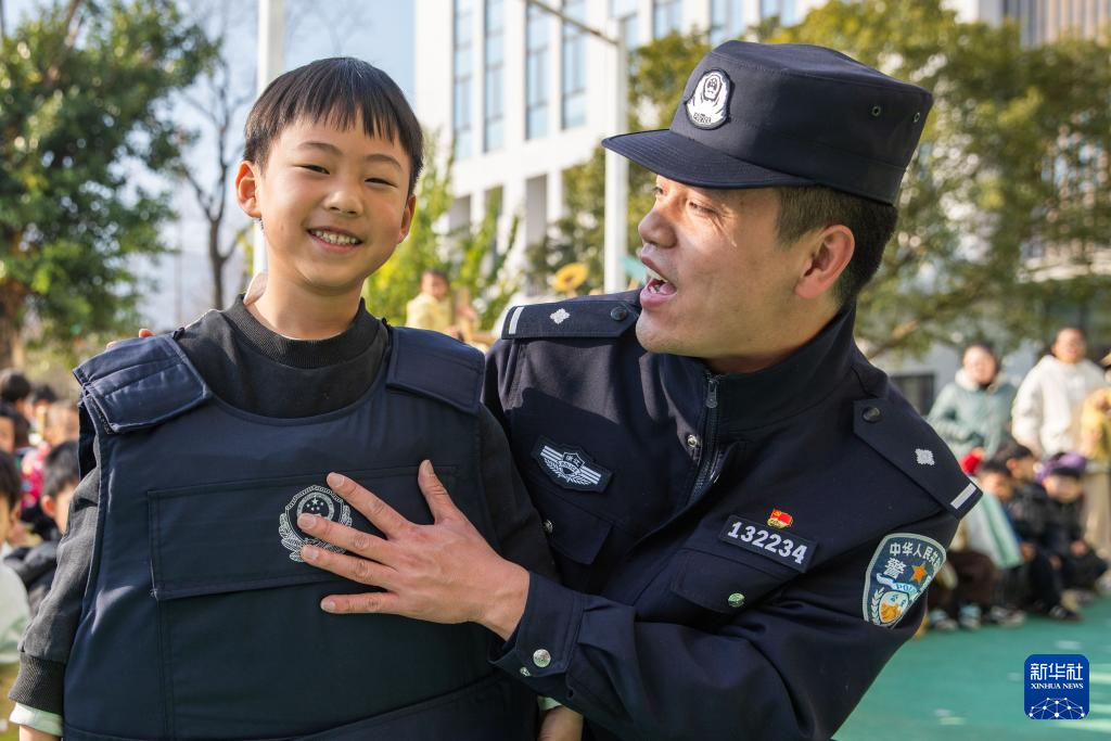 1月9日,在浙江省温州市第十五幼儿园,温州市公安局鹿城区分局上戍派出所民警指导小朋友体验警用装备。