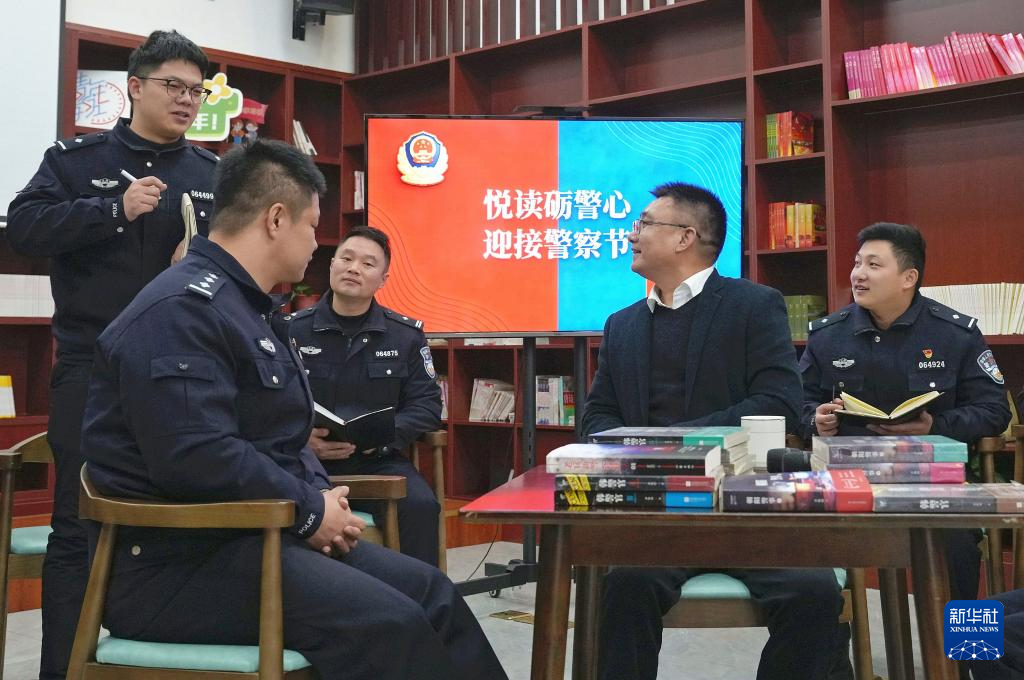 1月8日,江苏省海安市公安局滨海新区派出所民警与警务题材小说作家卓牧闲(右二)在阅读分享活动上交流。