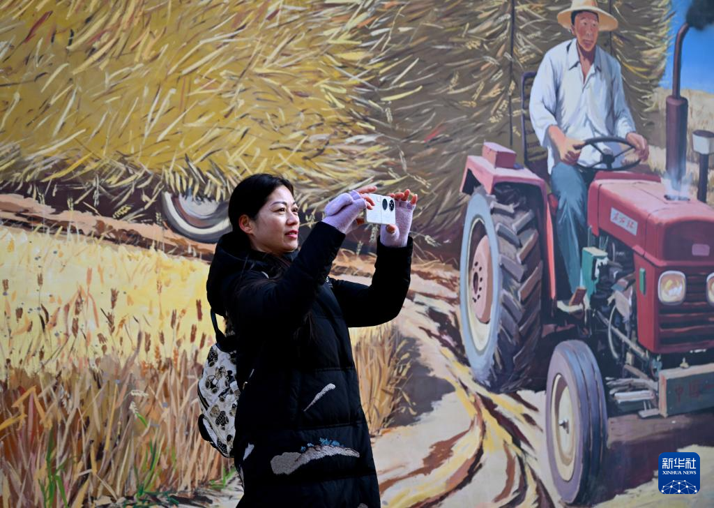 1月6日,在河南商丘睢阳区吴营村,游客在吴承言墙绘作品前拍照留念。