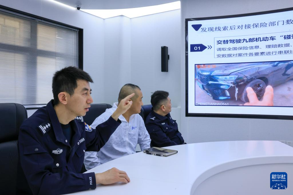 1月7日,在北京市道路交通事故警保合作远程处理中心的交通事故保险反欺诈合成作战室,民警与工作人员在分析研判有诈保嫌疑的交通事故。