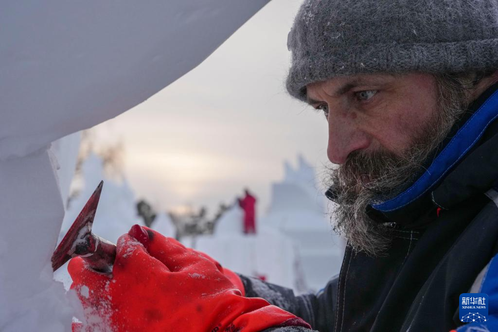 1月9日,俄罗斯阿穆尔斯克队参赛选手在进行雪雕作品《自由的幻象》收尾工作,作品最终获得最佳技巧奖。