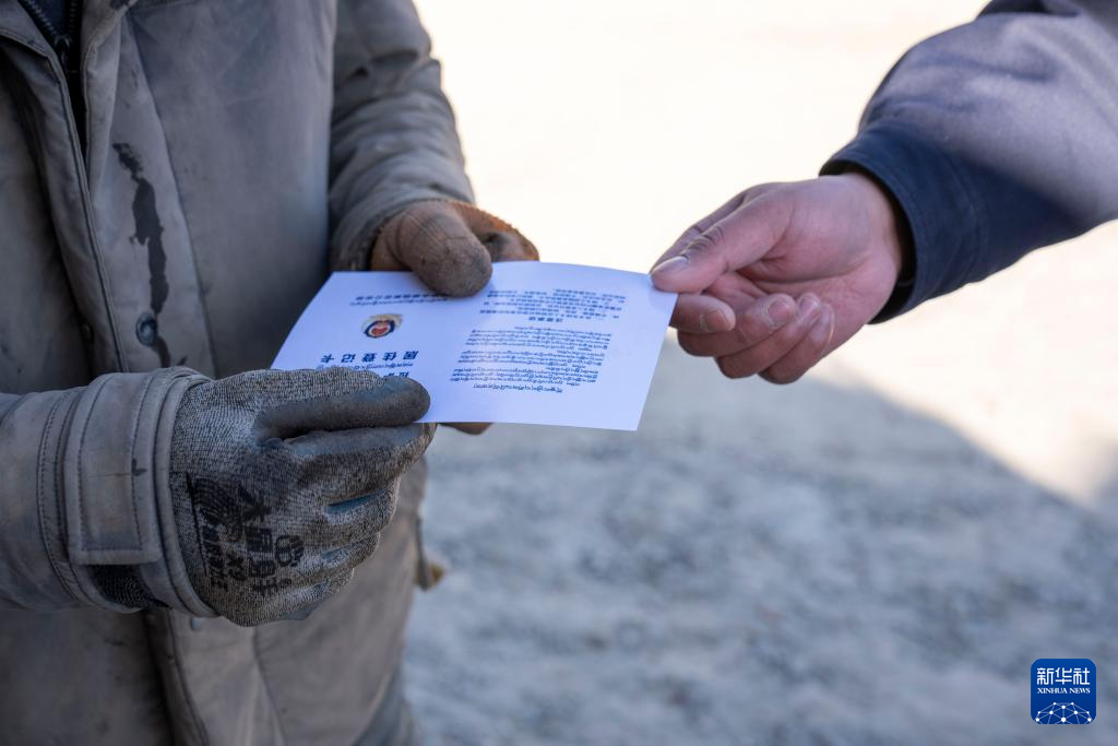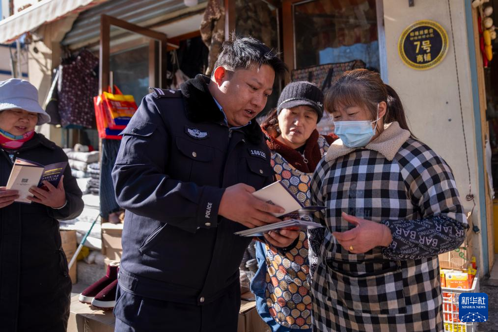 1月8日,金盾苑警务站民警刘洋(左一)和同事在拉萨高新区进行普法宣传。