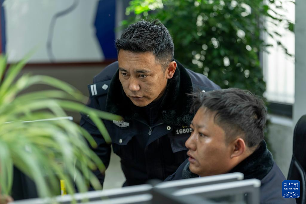 1月8日,热玛岗派出所所长洛桑次仁(左)和民警晋美扎巴在探讨网格工作。