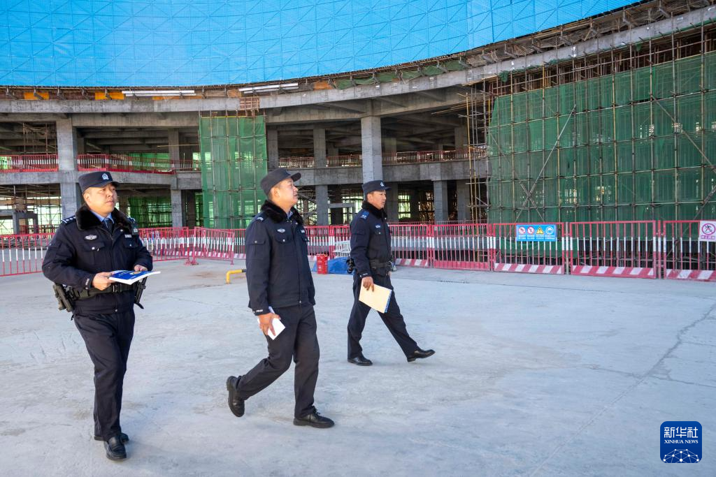 1月8日,金盾苑警务站民警黎江伟(左一)和同事在工地检查安全生产。