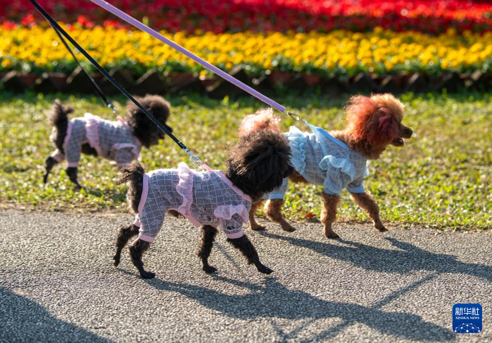 1月9日,海南省琼海市民在万泉河公园休闲溜狗。