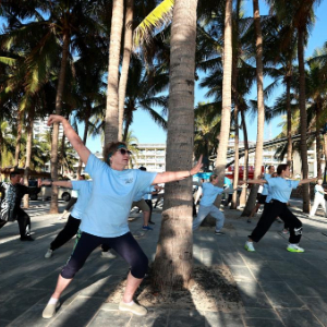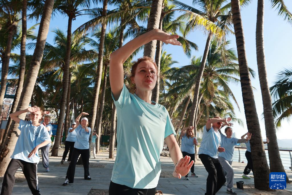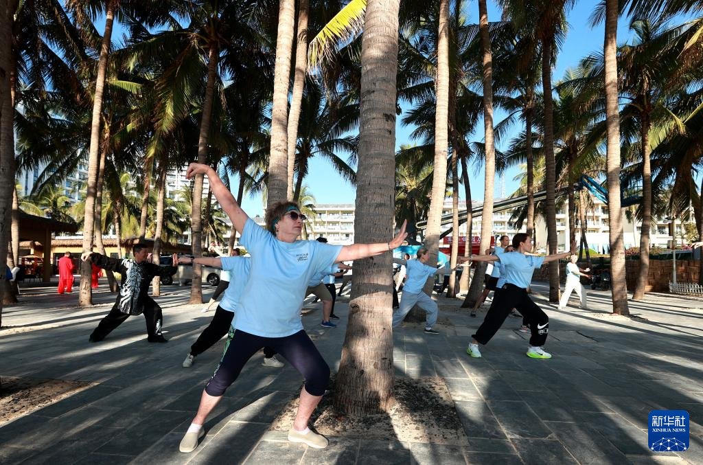 1月9日,在海南三亚大东海游览区,几名外国游客在椰林下学习打太极拳。
