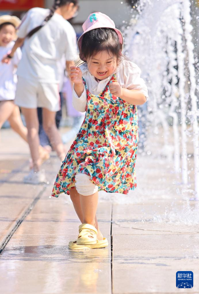 1月9日,小朋友在海南省三亚南山文化旅游区喷泉处戏水玩耍。