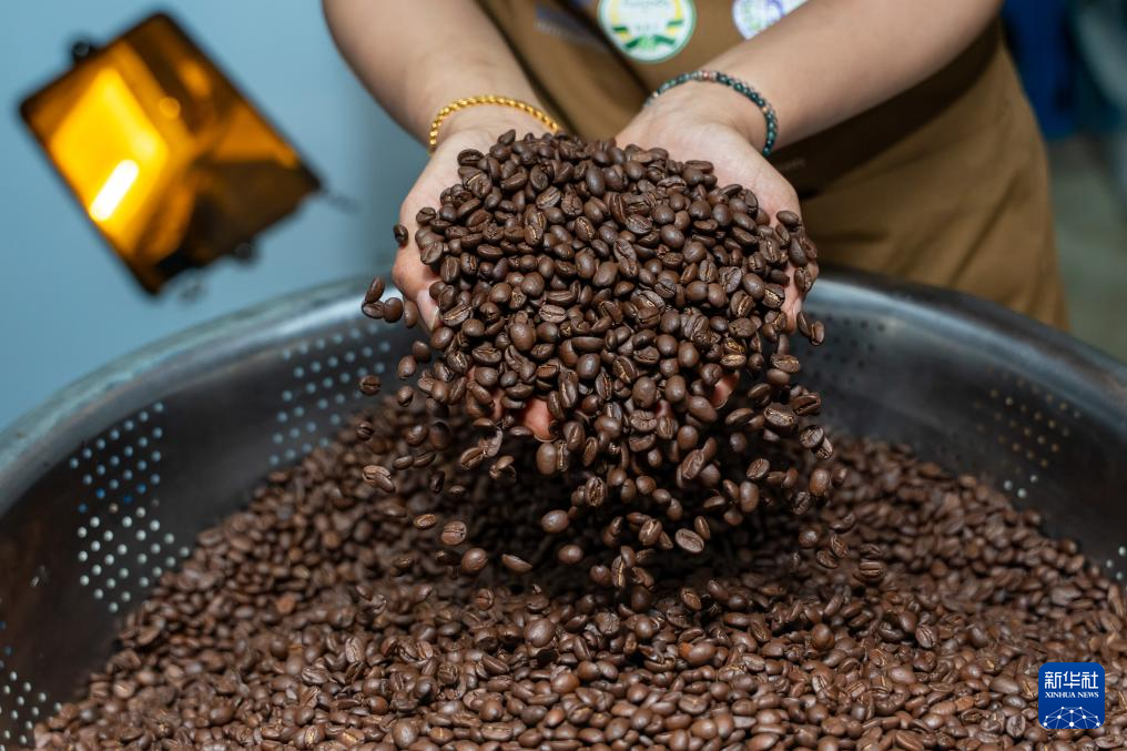 工作人员在老挝占巴塞省一处咖啡种植园展示烘焙完成的咖啡豆(2025年12月17日摄)。
