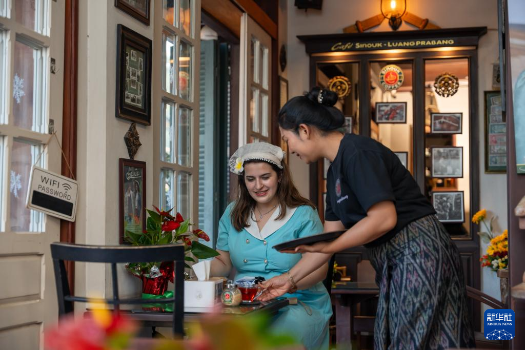 在老挝琅勃拉邦一家咖啡店,服务员为顾客端上咖啡(2025年12月31日摄)。
