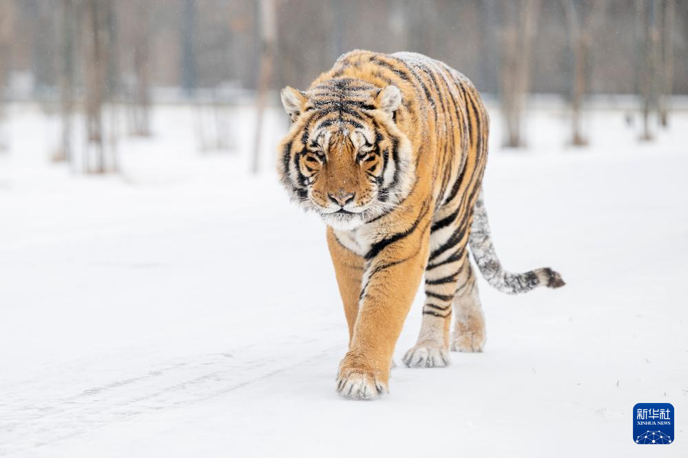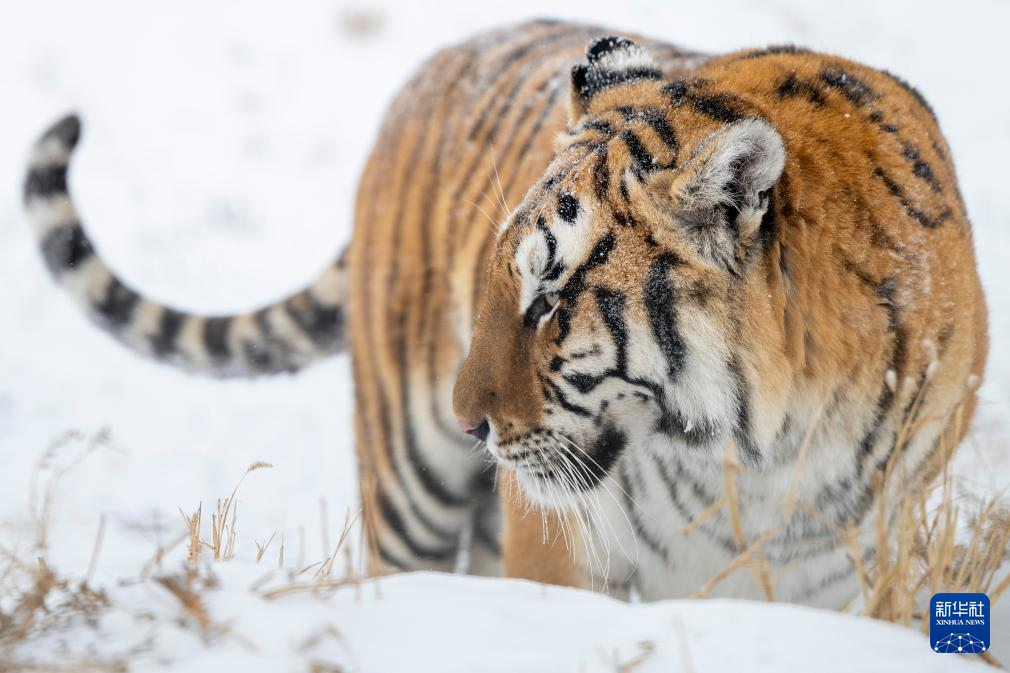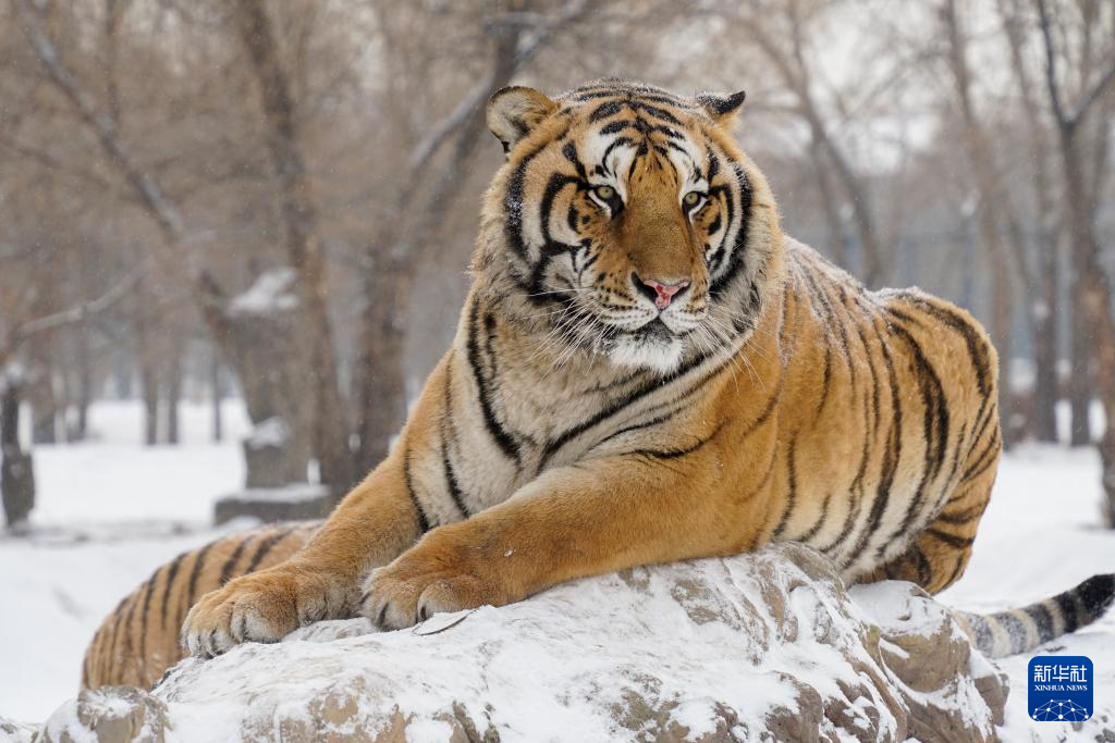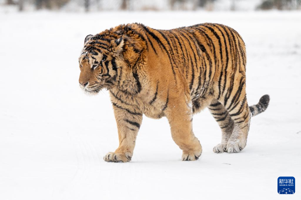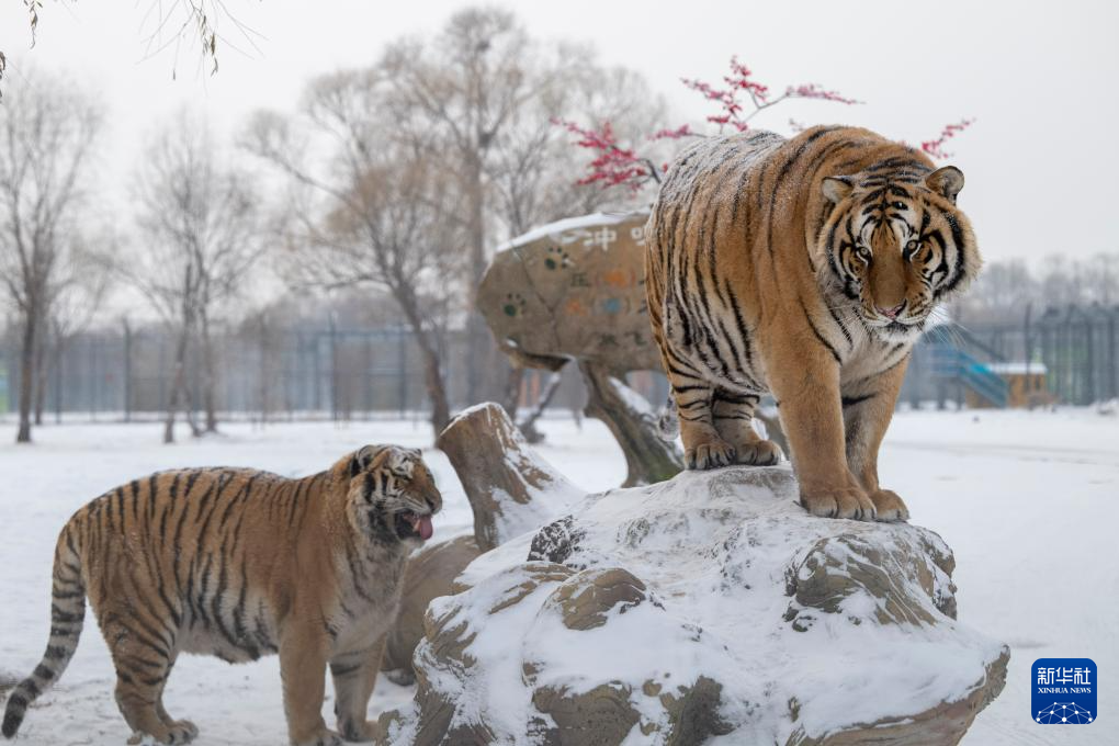 1月12日,冰城哈尔滨市迎来降雪天气,在黑龙江东北虎林园,散放区的东北虎在雪地活动。