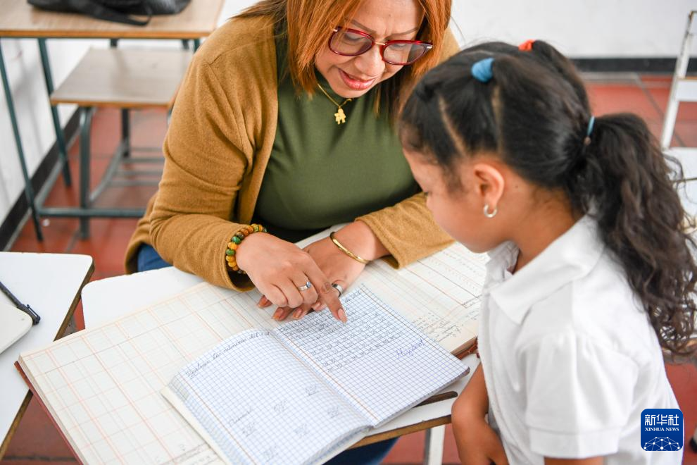 1月12日,在委内瑞拉首都加拉加斯一所公立学校,老师检查学生作业。