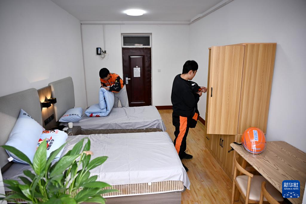1月14日,在青岛市李沧区“青暖红骑之家”,工作人员在宿舍内查看床铺和被褥。