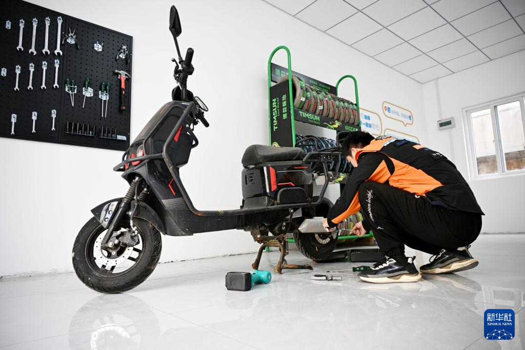 1月14日,在青岛市李沧区“青暖红骑之家”,骑手在修理点检修电动车。