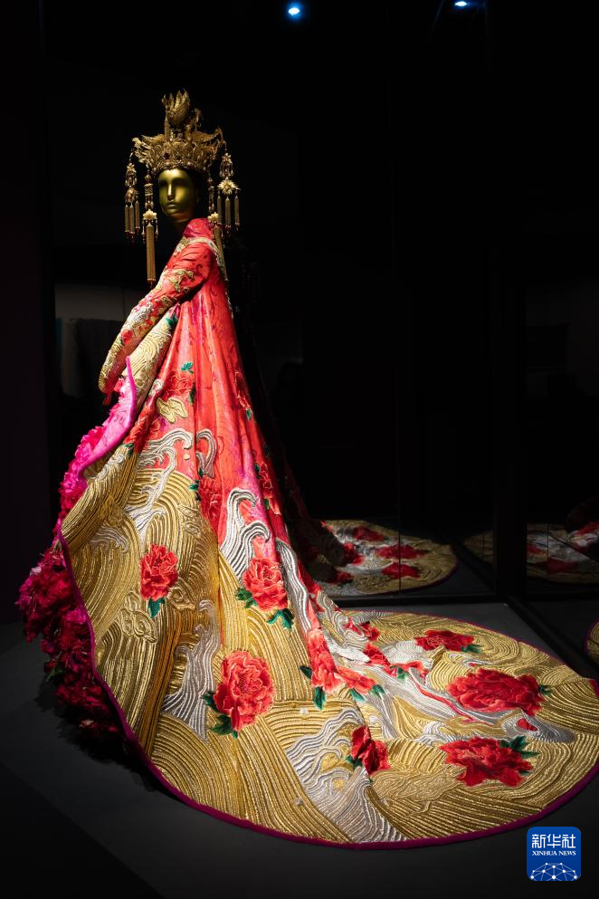 1月13日在展览上拍摄的高定艺术家郭培设计制作的婚服。