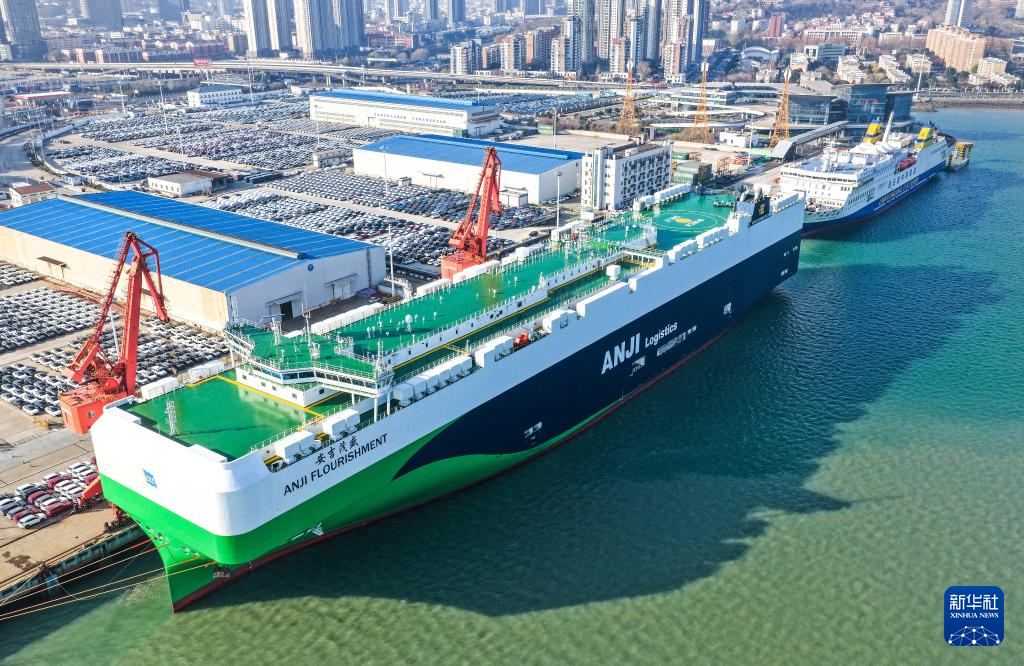 2025年12月17日,在江苏连云港港口68号泊位,一艘滚装船在装运出口汽车(无人机照片)。