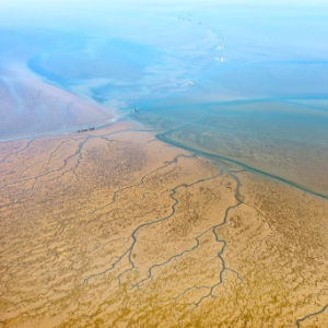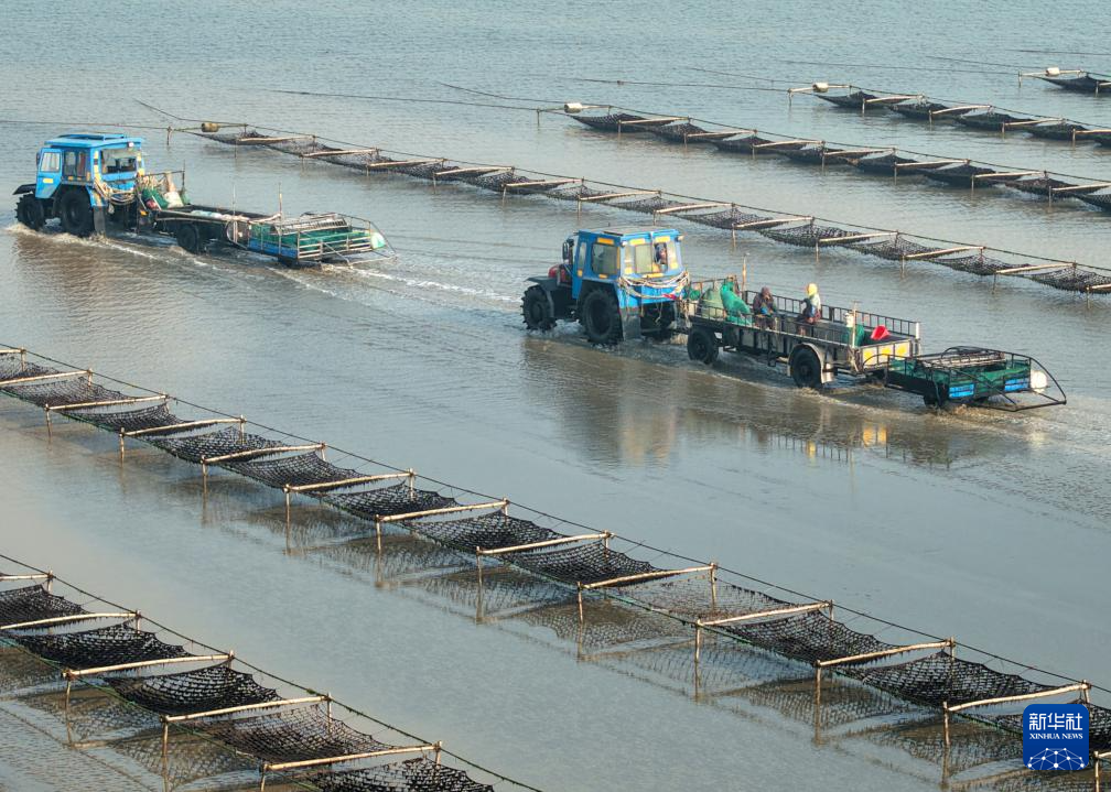 1月15日,养殖户驾驶拖拉机趁着退潮出海采收紫菜(无人机照片)。