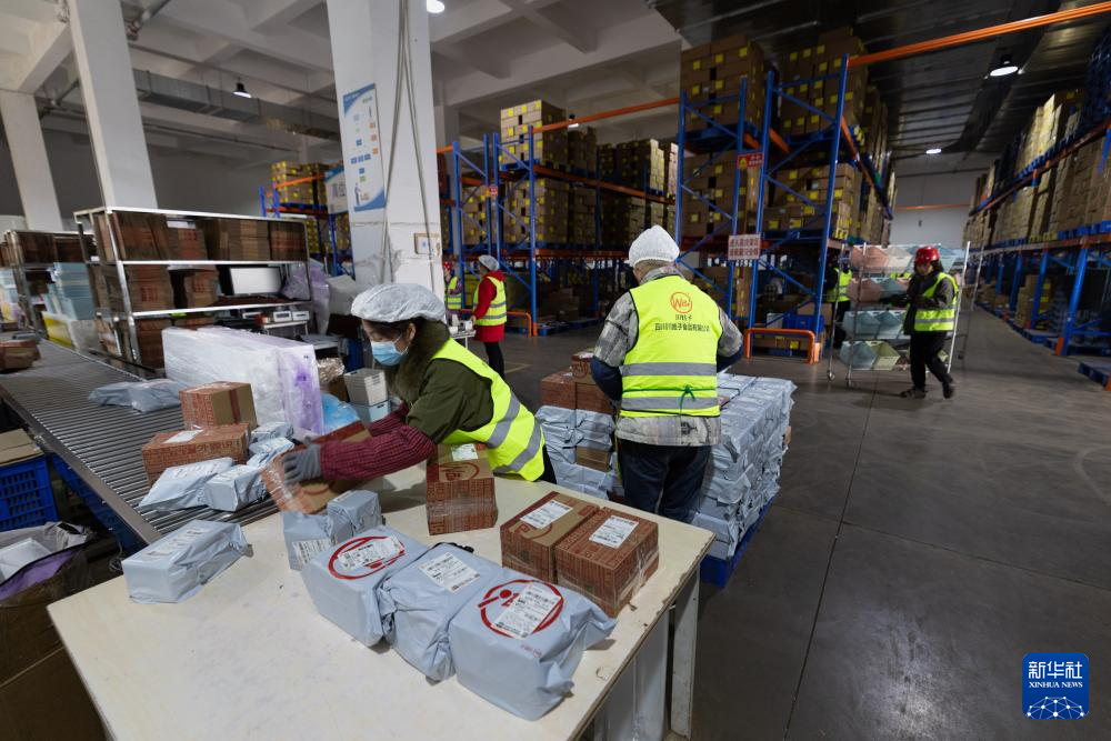 1月15日,在四川川娃子食品有限公司智能生态工厂,工人在物流车间分拣发往消费者手中的快递。