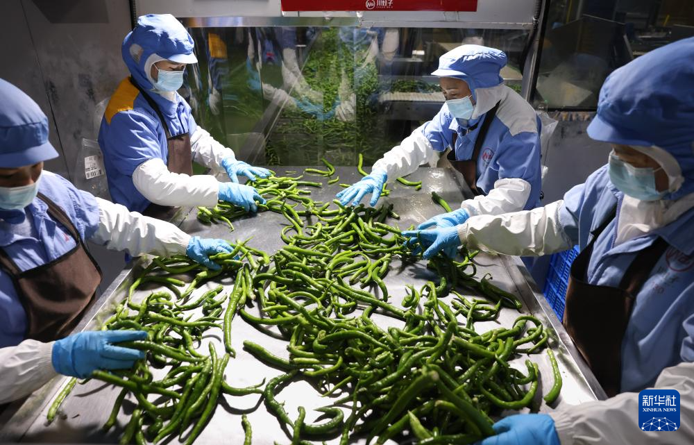 1月15日,在四川川娃子食品有限公司智能生态工厂,工人分拣二荆条辣椒。