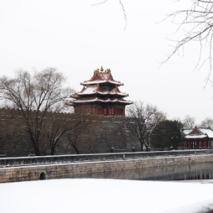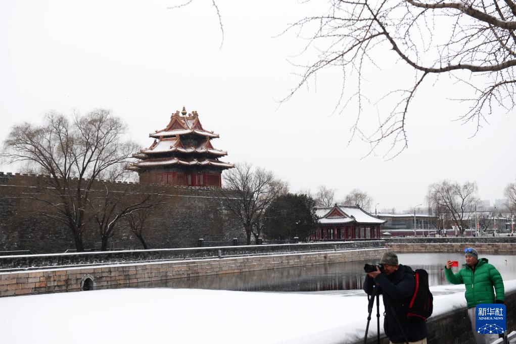 1月18日,人们在故宫角楼附近拍摄雪景。