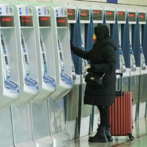 1月19日,旅客在南京南站售票大厅自助售票机上购票。