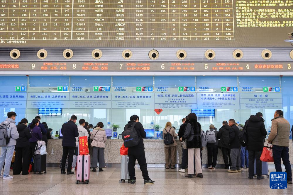 1月19日,旅客在南京南站售票处购买火车票。