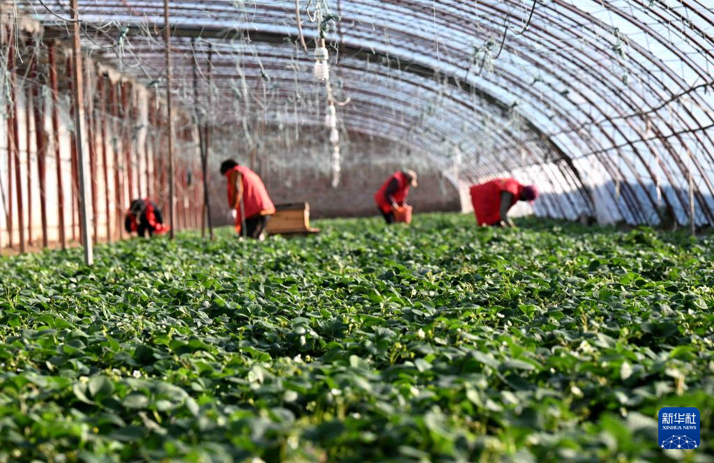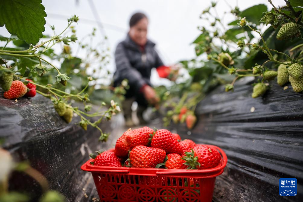 1月20日,农民在浙江省湖州市吴兴区埭溪镇美莓草莓园采摘草莓。