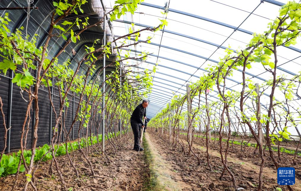 1月20日,河北省唐山市海港经济开发区王滩镇农民在葡萄大棚松土。
