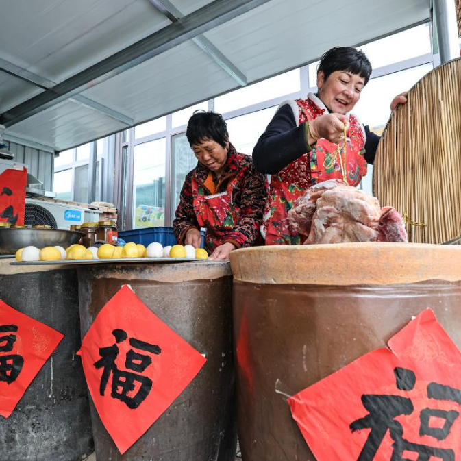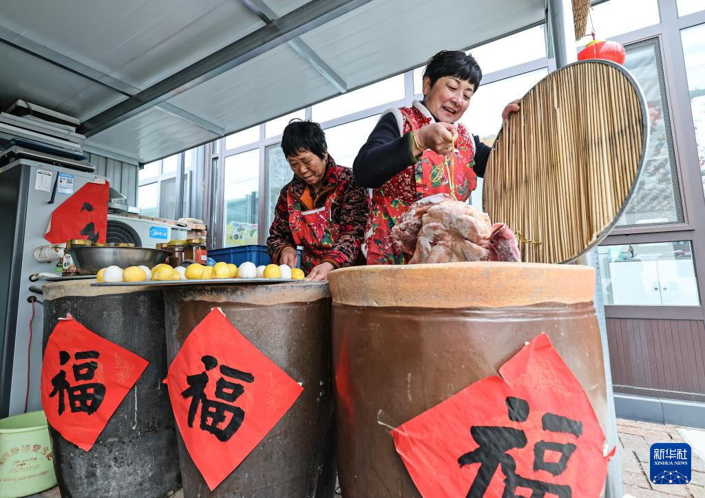 1月14日,祝家沟村村民唐凤杰(右)在家里准备年货。