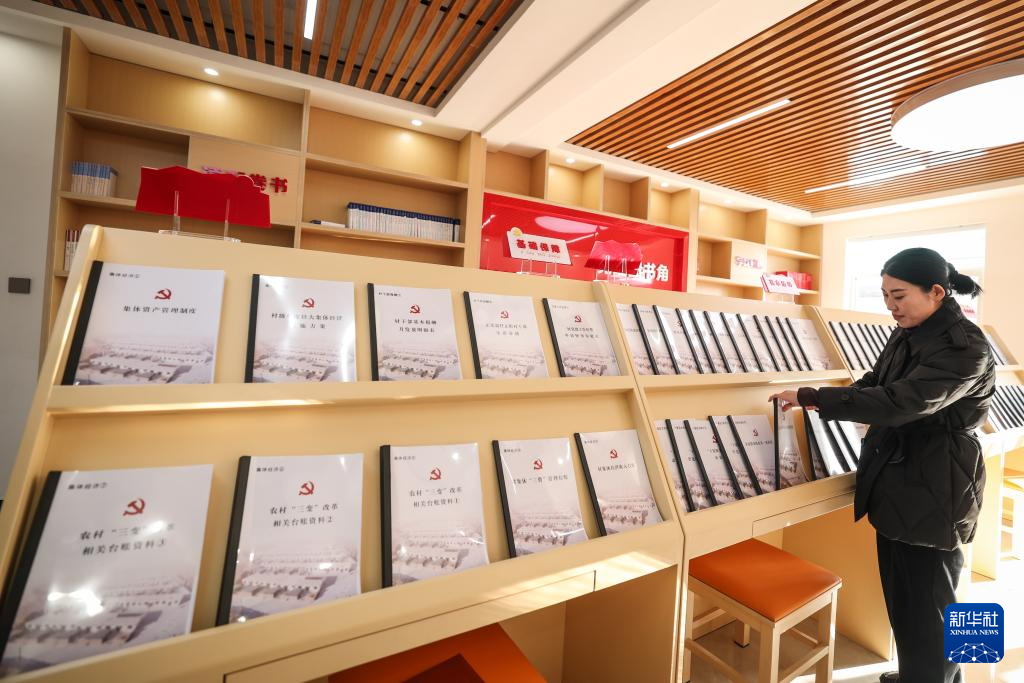 1月20日,祝家沟村党支部书记王丽丽在祝家沟村党群服务中心活动室内整理展示的资料。
