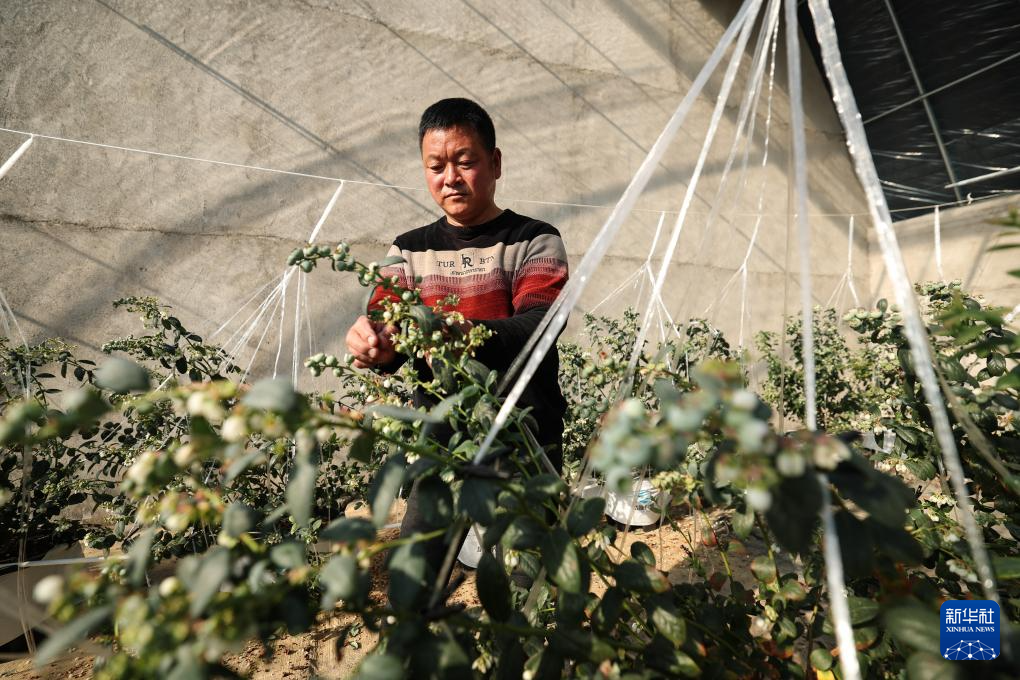 1月20日,村民在祝家沟村新建的高标准蓝莓大棚内进行日常维护工作。