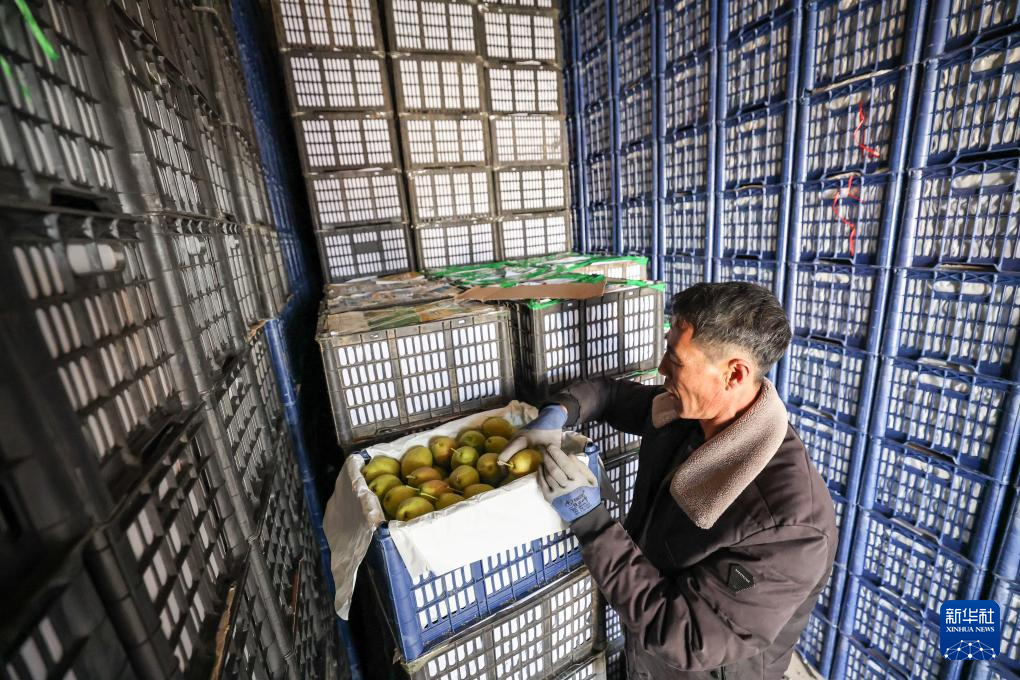 1月20日,村民在祝家沟村新建的恒温库内搬运水果。