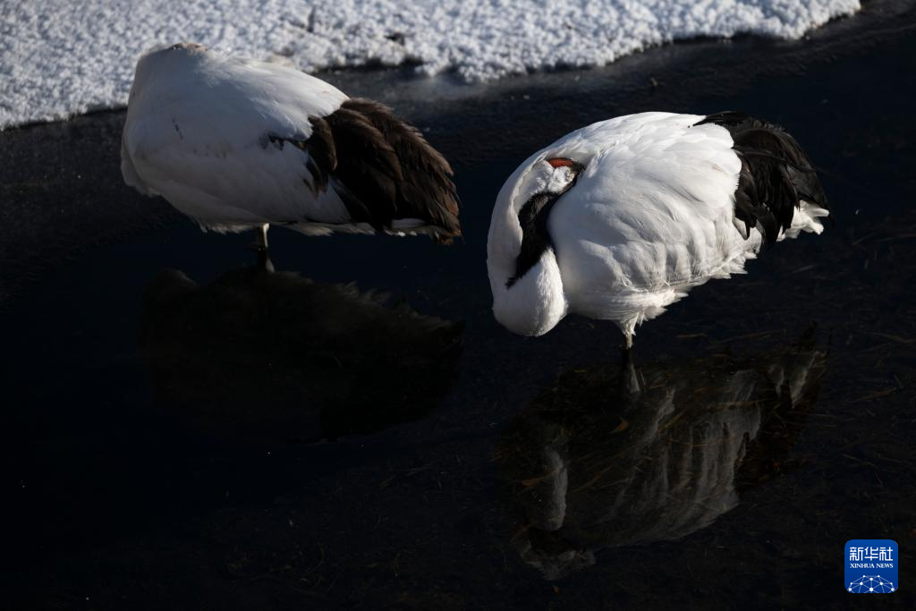 冬日时节,黑龙江扎龙国家级自然保护区内白雪皑皑,丹顶鹤在寒风中觅食,上演一幅鹤舞冬日的纯净画面。