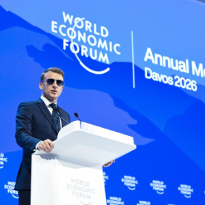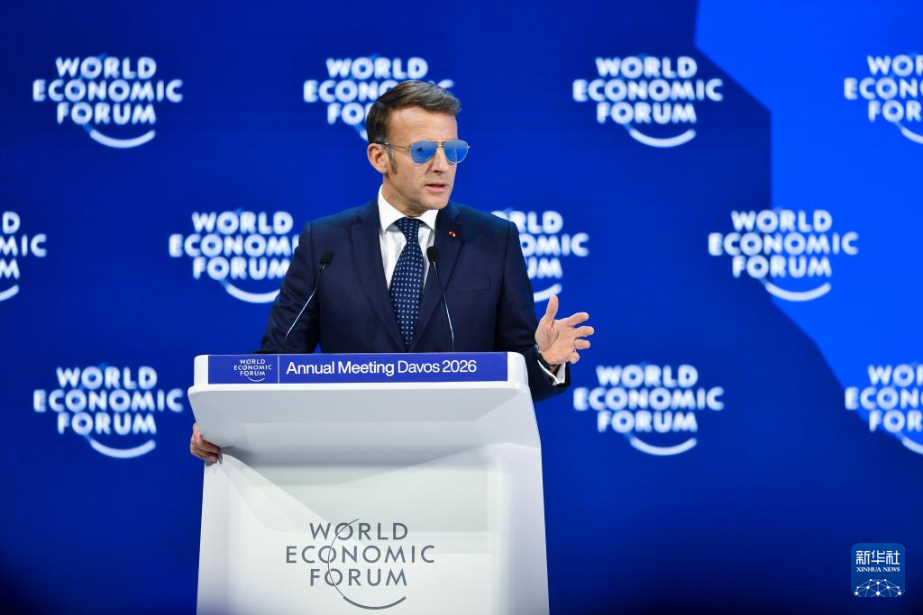 1月20日,法国总统马克龙在瑞士达沃斯举办的世界经济论坛2026年年会上讲话。